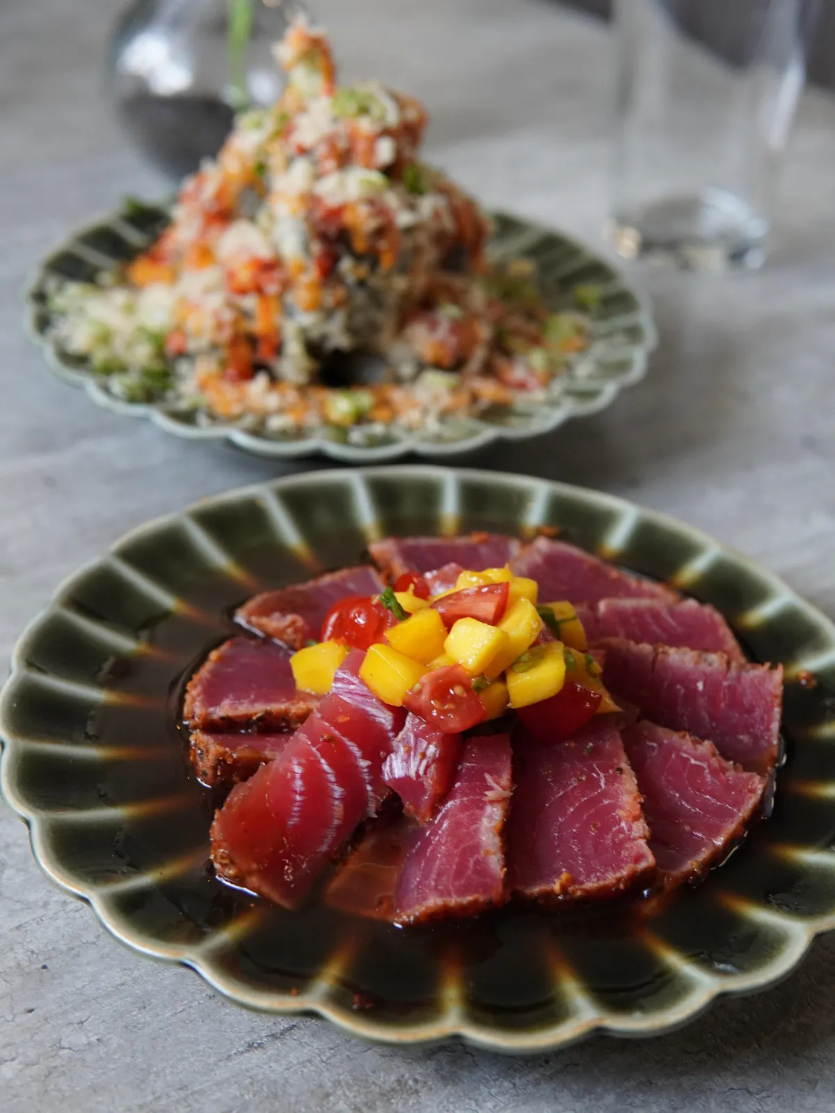 Spicy salmon tartar, fresh mango slices, and cucumber. Rolled with seaweed on the outside
